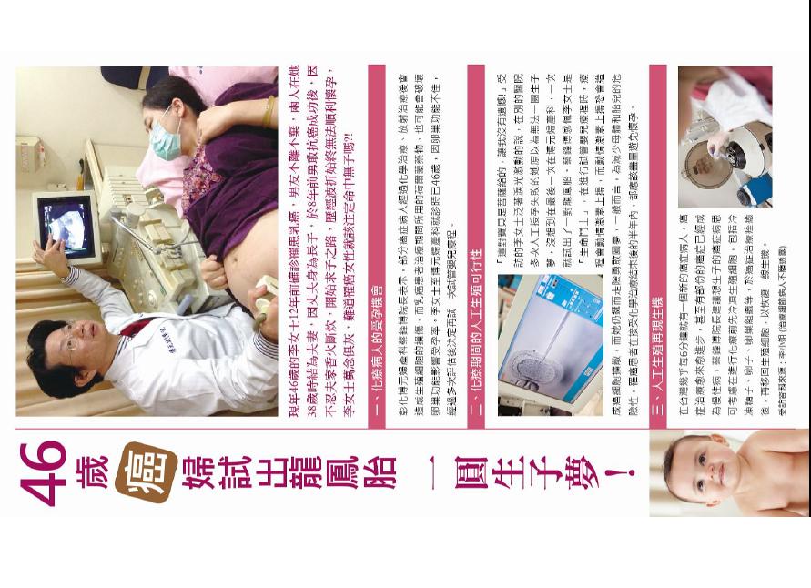蘋果日報報導博元婦產科: 乳癌第3期,開過刀,11次的化學治療,25次的放射治療後別醫院十多次失敗,在博元婦產科只做一次試管嬰兒雙胞胎 照片...