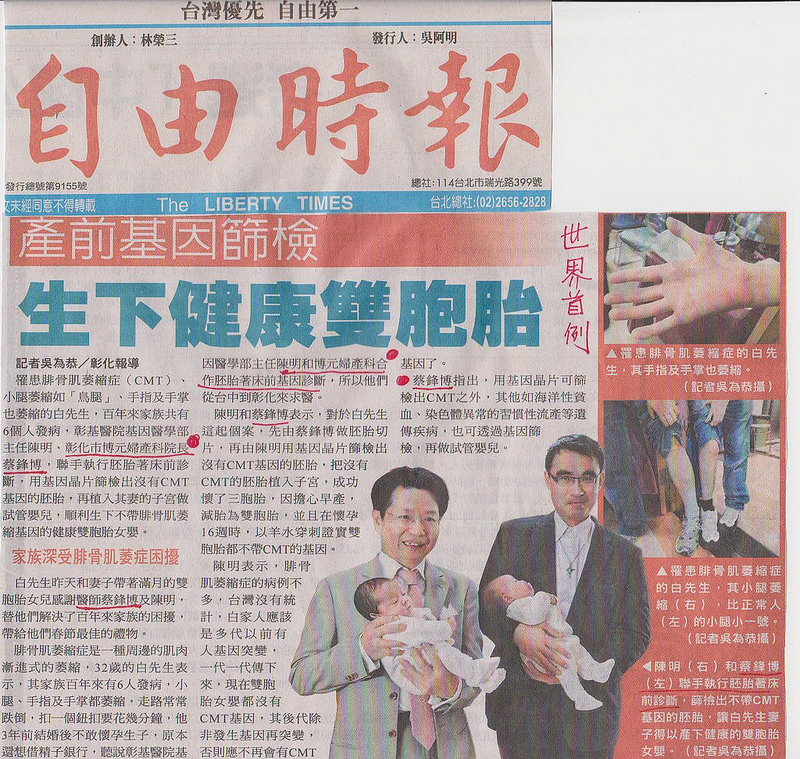 新基因定序 產健康試管嬰 篩除壞胚胎費用減半 成功率升為8成 蘋果日報報導並專訪彰化市博元婦產科院長蔡鋒博醫師-談博元婦產科及國內和英國牛津大學的第三代試管嬰兒:基因晶片試管嬰兒 新!超快速(NGS)基因晶...