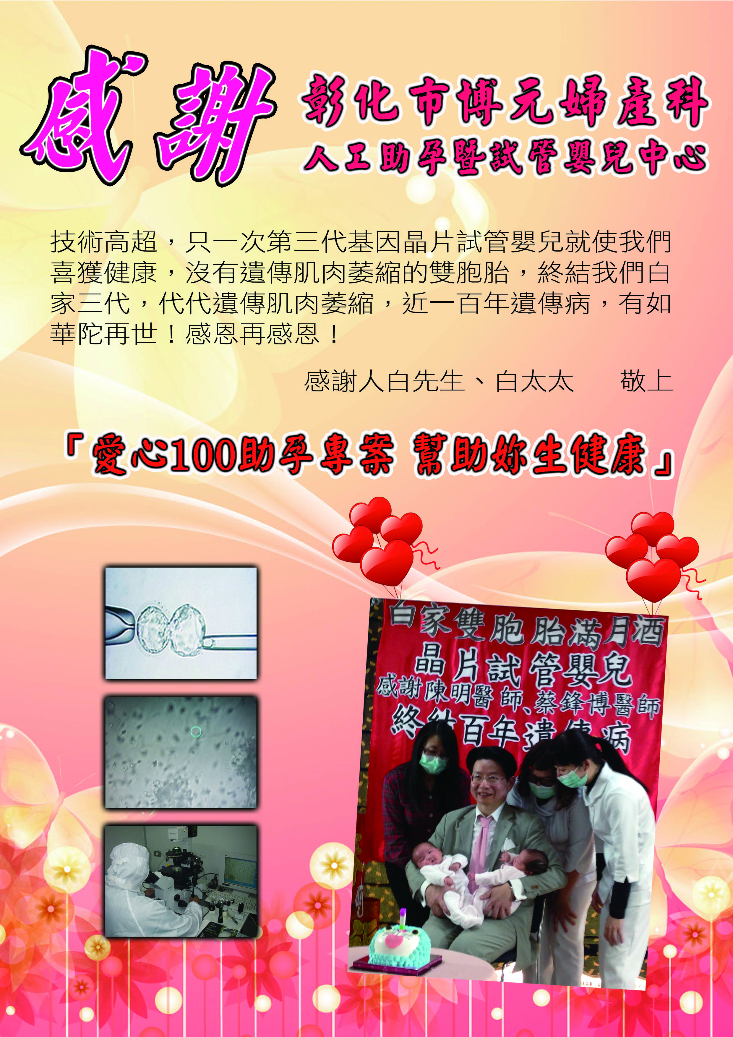 博元婦產科回饋社會 推出愛心100助孕專案提供100名額 幫助妳生健康寶寶 100 胚胎基因篩選生下健康寶寶 終結家族遺傳疾病宿命 博元婦產科回饋社會 推出愛心100助孕專案提供100...