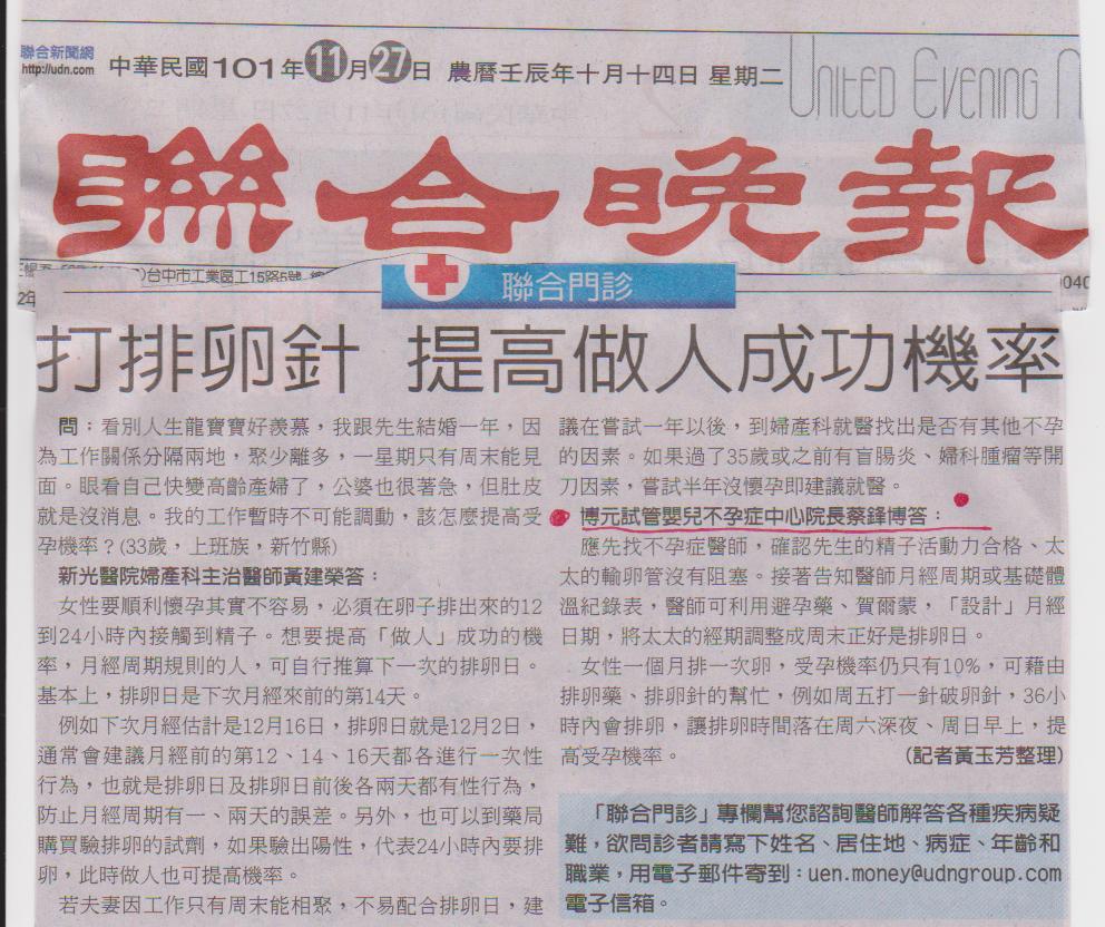 打排卵針提高做人成功機率---聯合晚報-報導博元婦產科試管嬰兒 ...2012.11.28