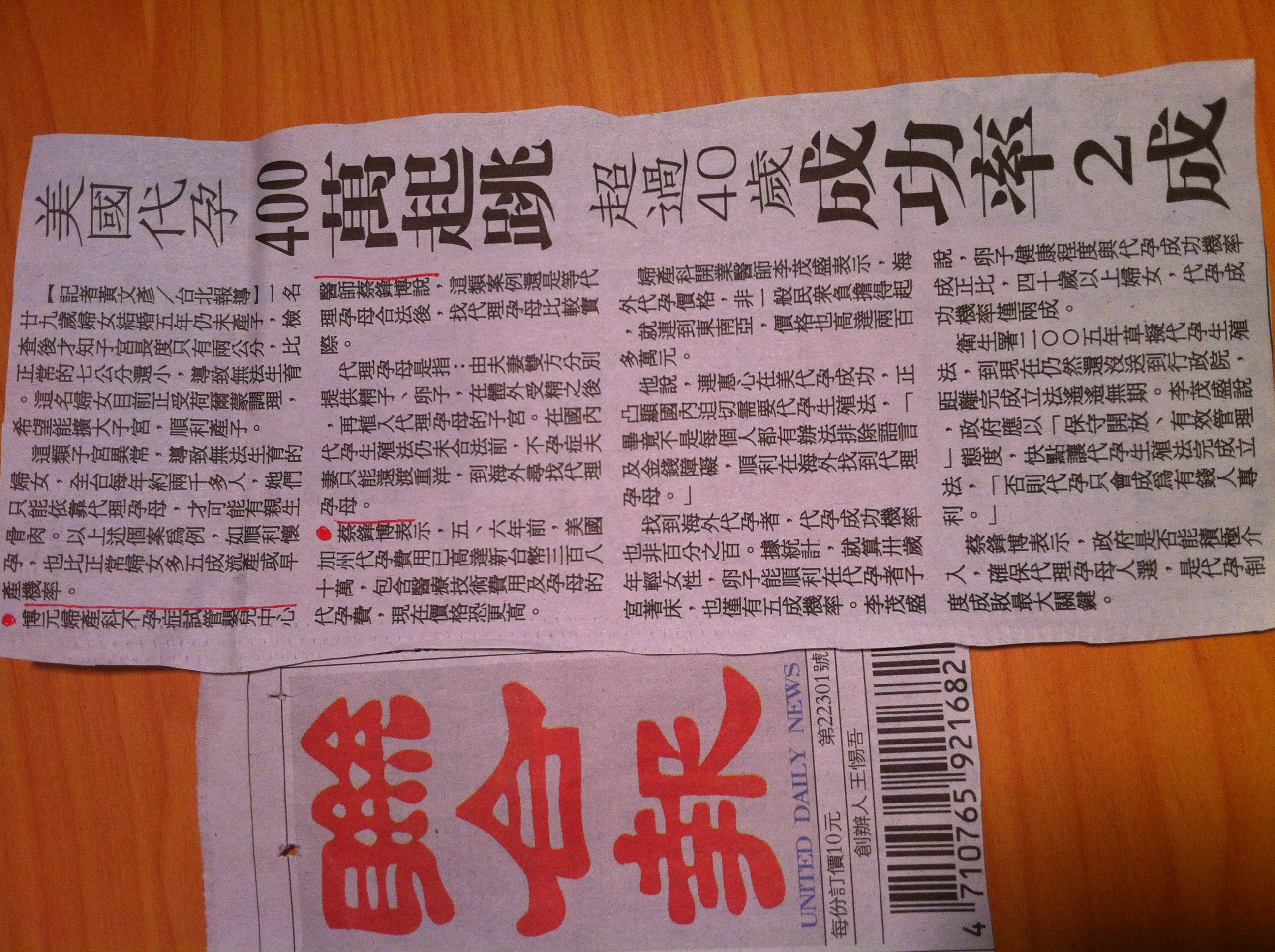 美國代孕400萬起跳 超過40歲…成功率2成 聨合報 報導博元婦產科試管嬰兒 http://www.flickr.com/photos/41541241@N08/8190962277/in/photostream