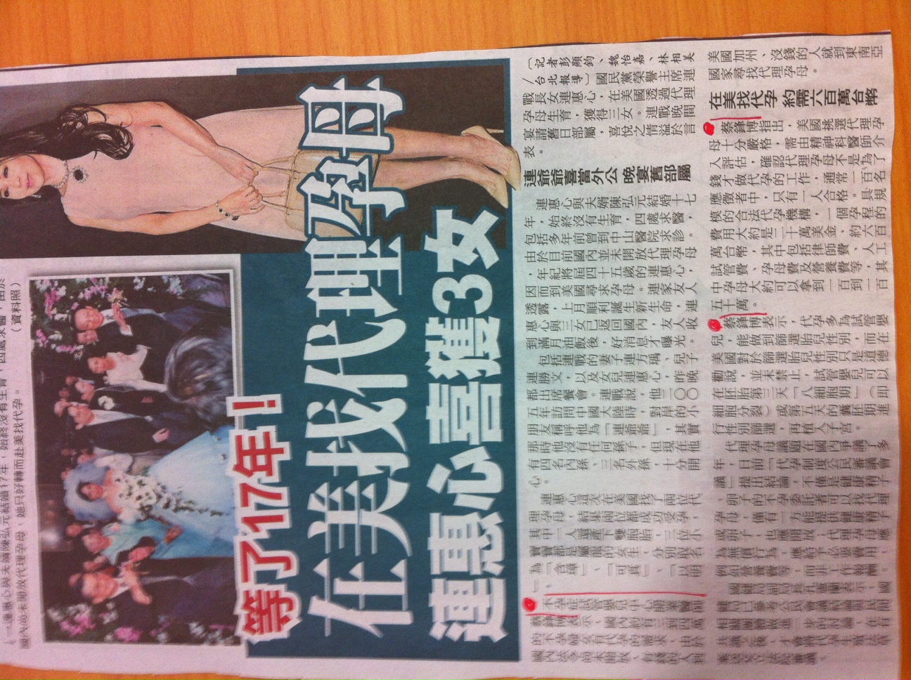 連惠心與夫婿陳弘元結婚十七年,始終沒有生育,四處求醫,包括多年前曾到中山醫院求診。由於目前國內並未開放代理孕母,年紀將屆四十五歲的連惠心,因而到美國尋求孕母。連家友人透露,上月順利誕生新生命,連惠心與三女已返回國內,友人收到滿月油飯後,好消息才曝光。