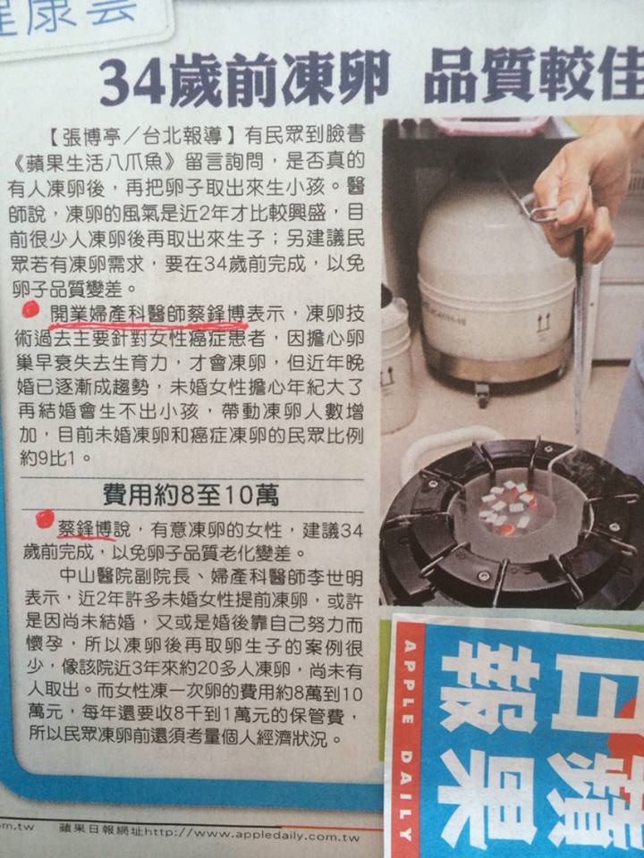 蘋果日報報導並專訪彰化市博元婦產科院長蔡鋒博醫師-談凍卵 -健康雲:34歲前凍卵 品質較佳 健康雲:34歲前凍卵 品質較佳  ...