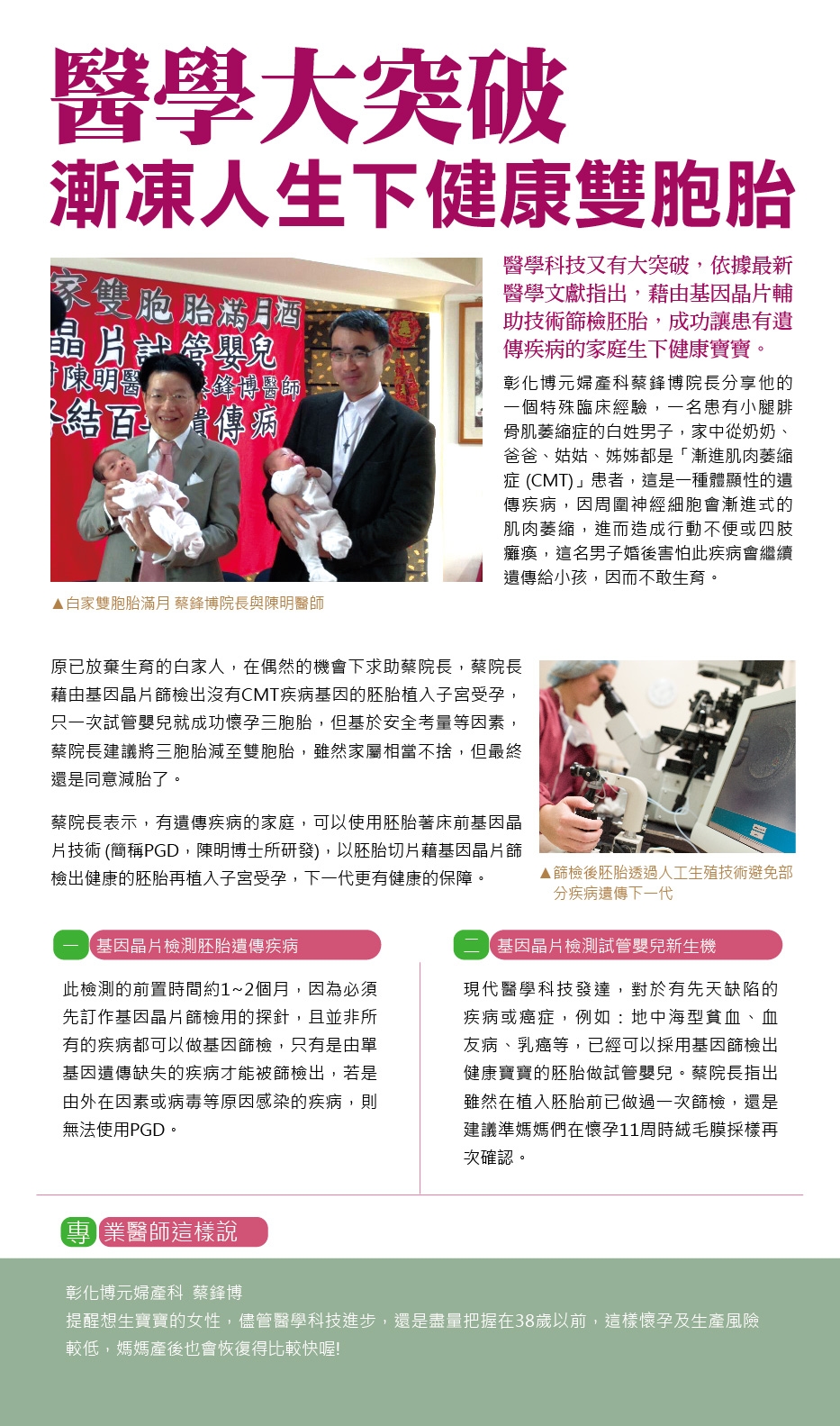 蘋果日報報導博元婦產科不孕症試管嬰兒: 蘋果日報報導,博元婦產科和基因醫學陳明博士 合作之第三代基因晶片試管嬰兒成功案例: 此漸凍人家庭 終結百年噩夢,生下兩個...