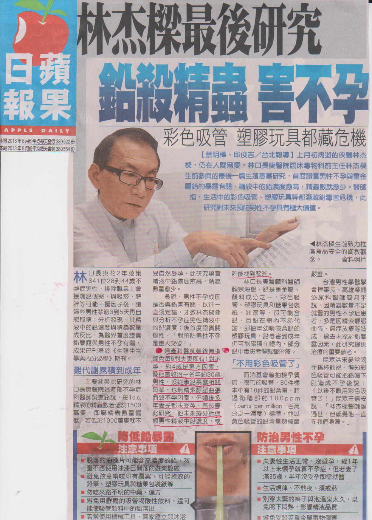 林杰樑最後研究 鉛殺精蟲 害不孕 彩色吸管 塑膠玩具都藏危機 蘋果日報報導博元婦產科:博元婦產科醫師蔡鋒博指國內每6對夫妻即有1對不孕,約4成是男方因素,像他曾收治一名年約30歲男性,沒從事鉛暴露相關職業,也...