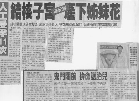 人工受孕11次 結核子宮博元婦產科做試管嬰兒產下姊妹花 【吳慧芬/台北報導】 在無數的淚水與加護病房生死關頭下,歷經11次人工受孕的林太太,於昨日產下一對雙胞胎女嬰,這位在母親節前夕終於當成媽媽的案例,創下世界少見子宮染有...