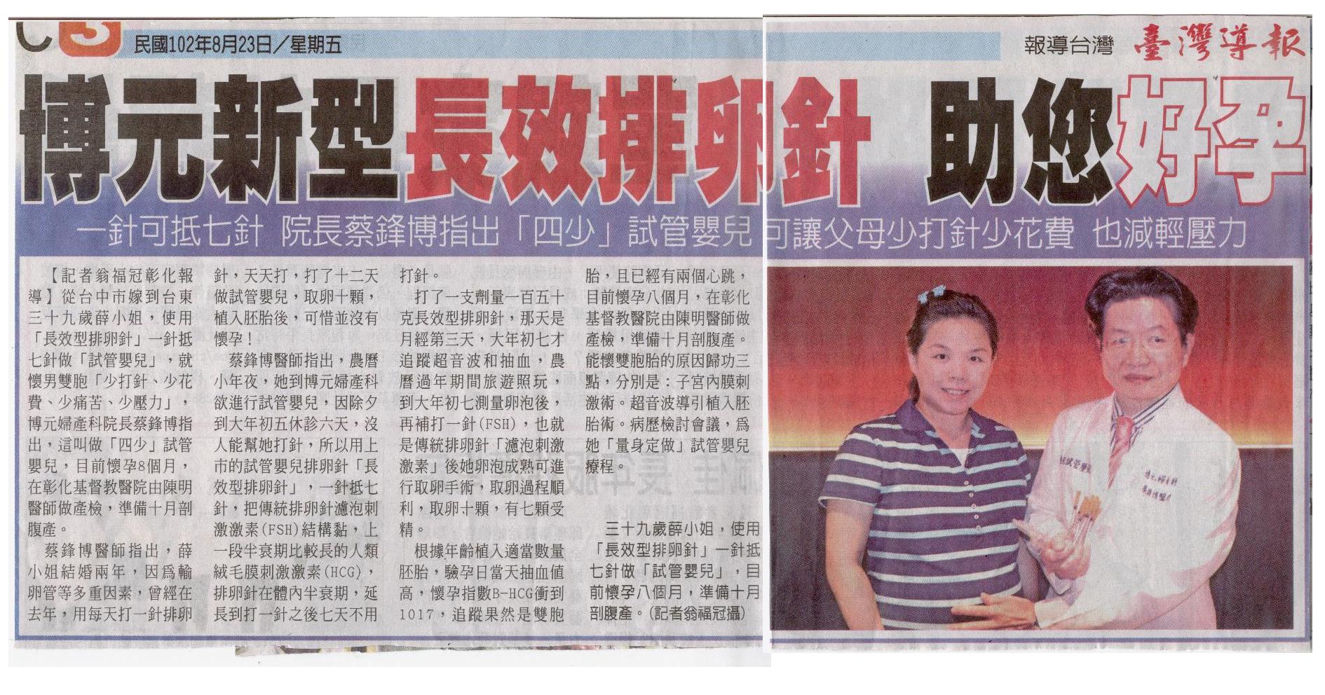四少試管嬰 博元婦產科一舉得雙胞胎-台灣導報.博元新型長效排卵針 助您好孕-台灣時報 新型長效型排卵針助懷孕--從台中市嫁到台東三十九歲薛小姐,使用「長效型排卵針」一針抵七針做「試管嬰兒」,就懷男雙胞「少打針、少花費、...