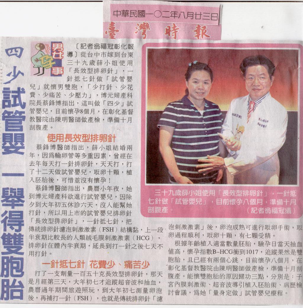 四少試管嬰 博元婦產科一舉得雙胞胎-台灣導報.博元新型長效排卵針 助您好孕-台灣時報 新型長效型排卵針助懷孕--從台中市嫁到台東三十九歲薛小姐,使用「長效型排卵針」一針抵七針做「試管嬰兒」,就懷男雙胞「少打針、少花費、...