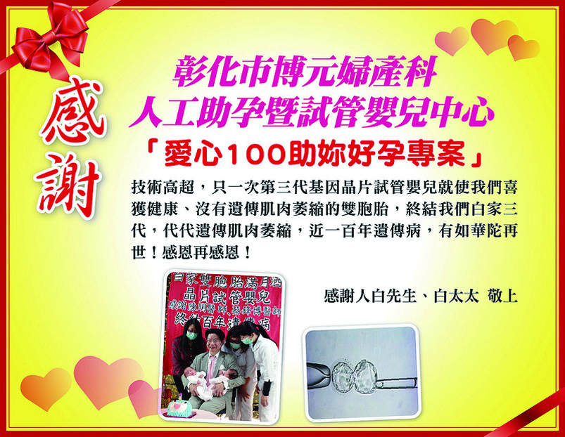 博元婦產科愛心100助孕專案提供100名額 幫助妳生健康寶寶 胚胎基因篩選生下健康寶寶 終結家族遺傳疾病宿命 博元婦產科回饋社會 推出愛心100助孕專案提供...