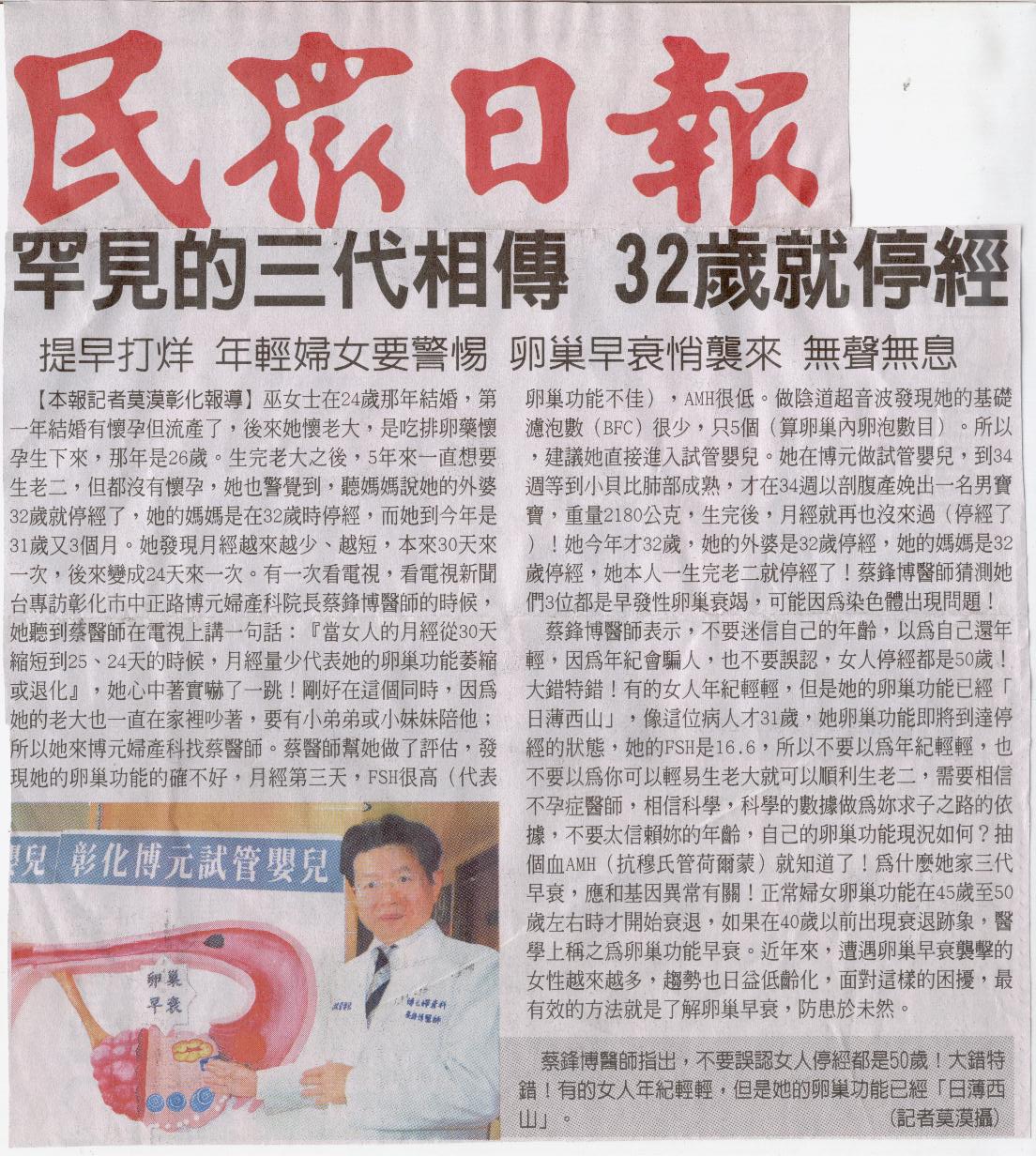 博元婦產科罕見的三代相傳 32歲就停經-民眾日報 http://www.flickr.com/photos/41541241@N08/8579228206/in/photostream <...