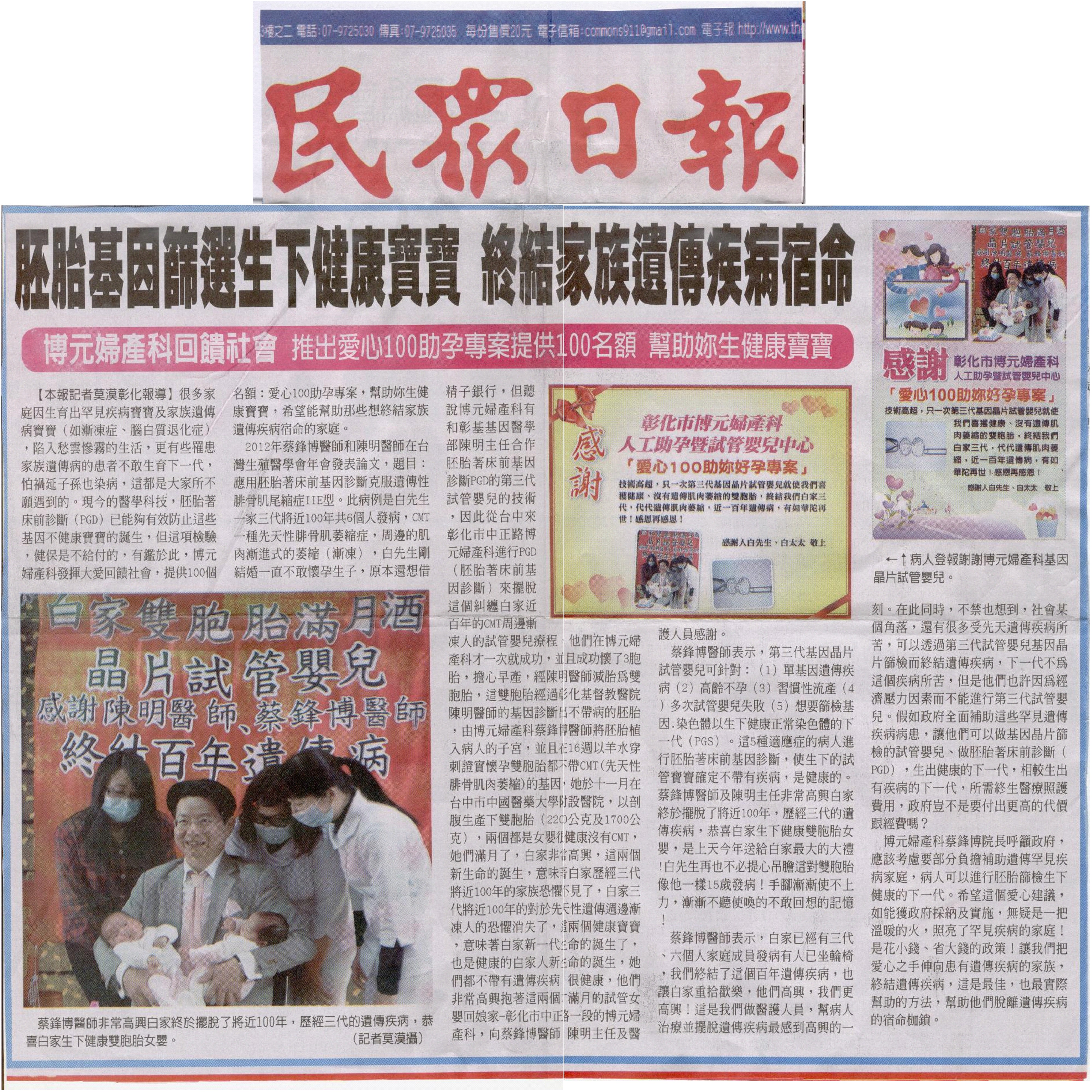 博元婦產科回饋社會,推出愛心100助孕專案,提供100名額,實質幫助妳生健康寶寶--博元婦產科基因篩檢生下健康寶寶 終結家族遺傳疾病宿命-民眾日報 http://www.flickr.com/photos/41541241@N08/8562...